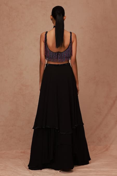 Black scoop neck blouse with multi color beaded fringe detailing. Paired with a layered lehenga featuring an A-line drape.