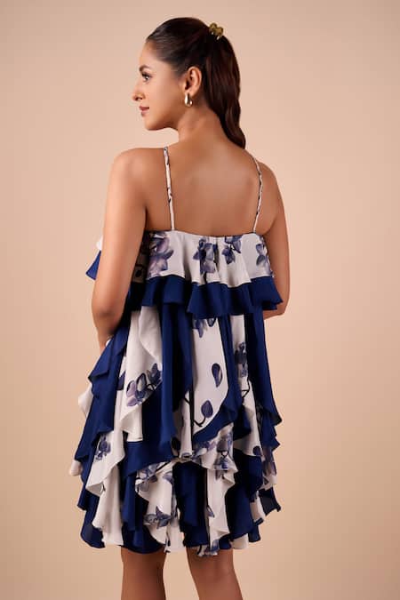 Blue Silk Halter Neck Orchid Printed Ruffle Dress