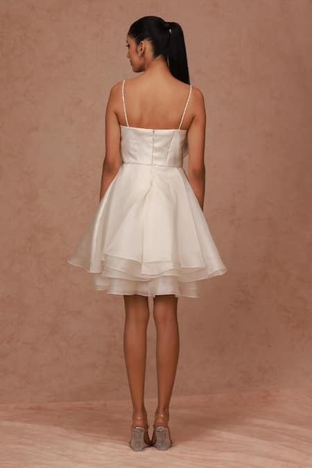 Ivory silk organza dress featuring layered draping and a large rose motif