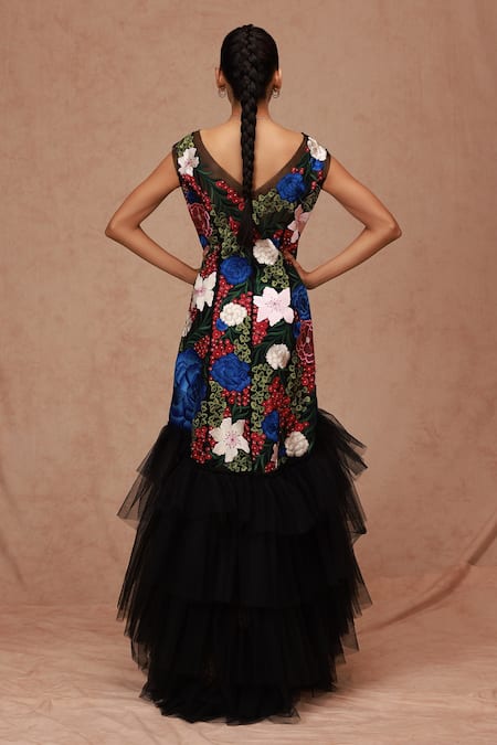 Black tulle asymmetric dress featuring multi-color floral embroidery and ruffle layer detailing