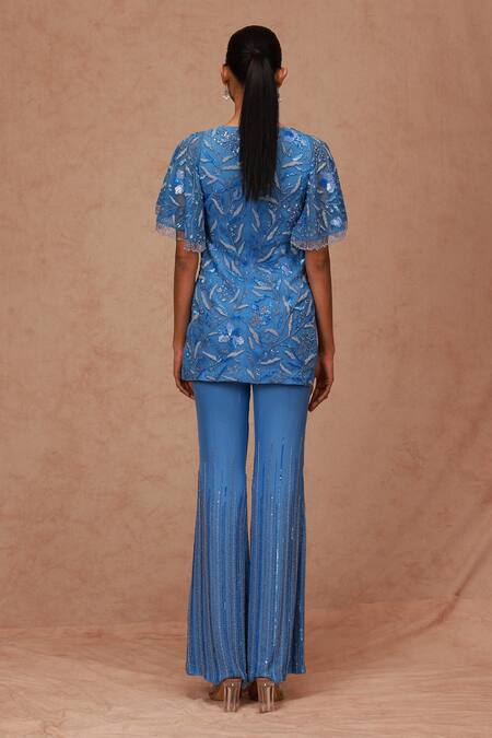 Blue silk chiffon tunic featuring all-over sequin floral embroidery and flared sleeves. Paired with matching flared pants embellished with sequins.