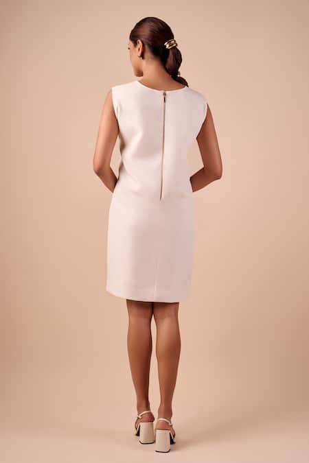 Ivory shift dress featuring hydrangea embellishments.