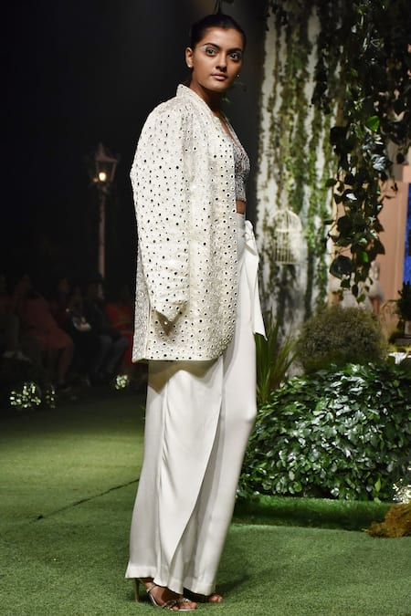 Buy_Shriya Som_Grey V Neck Mirror Embellished Crop Top_at_Aza_Fashions