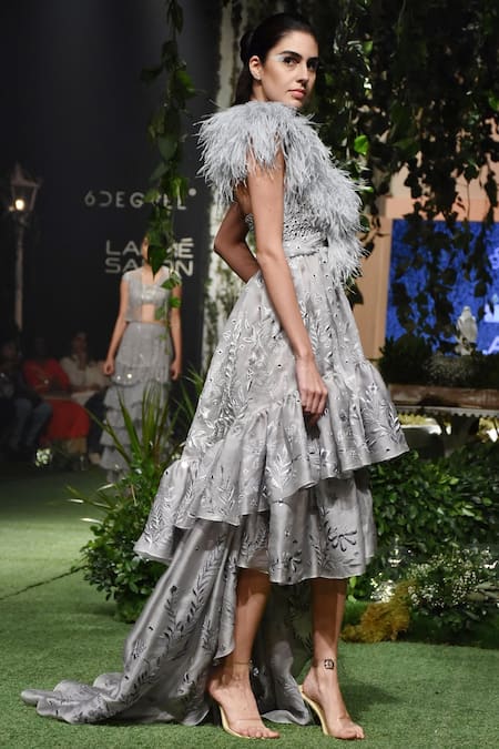 Buy_Shriya Som_Grey Tulle Ostrich Feather Cape_at_Aza_Fashions