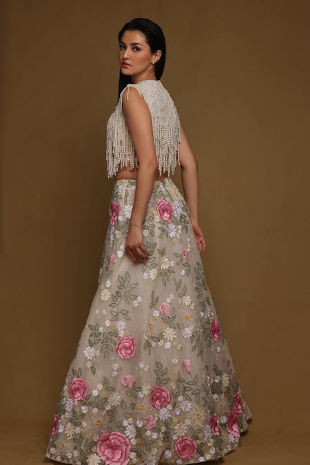 Ivory Tulle Pearls Round Neck Fringe Top