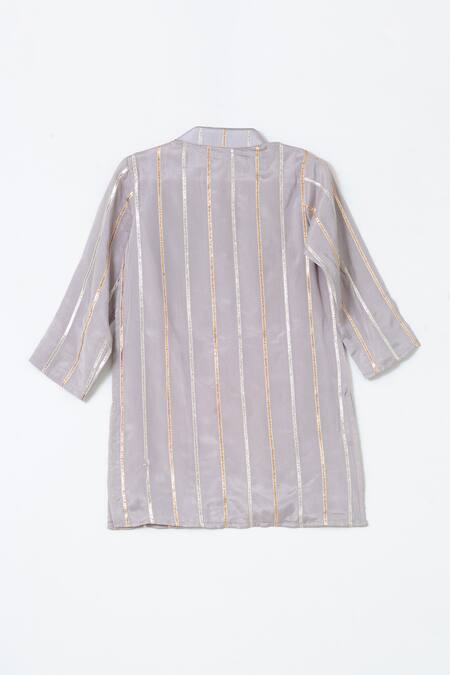 Light grey kurta featuring gota and stripe embroidery with a mandarin collar