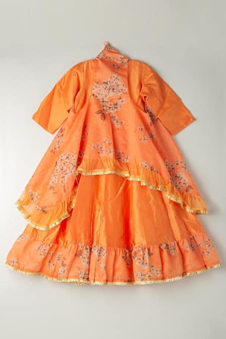 Orange anarkali featuring gota embroidered neckline and sleeve hem. Paired with a floral printed sleeveless cape with a ruffle border and asymmetric hem.