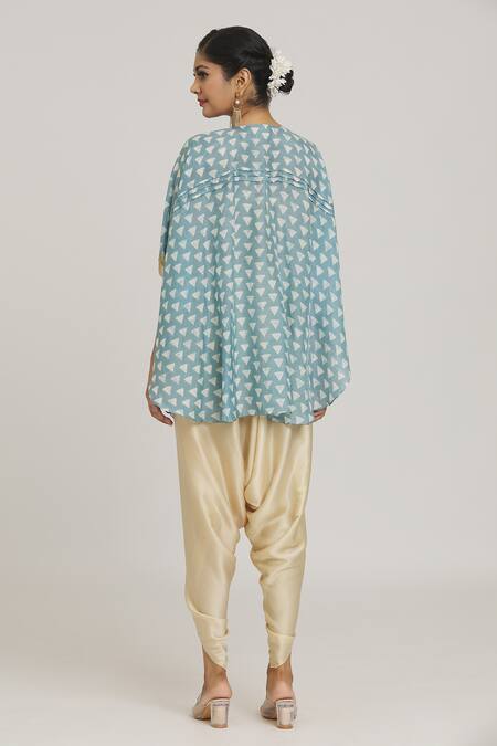 Blue draped tunic featuring embroidery, cowl detailing, and geometric pattern. Paired with a tulip pant for a cohesive look.