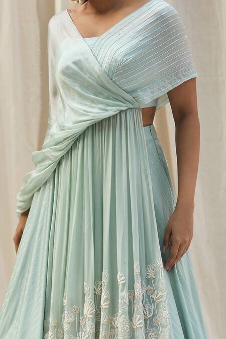 Ice blue draped blouse with attached drape in floral embroidered motifs. Paired with pleated lehenga.