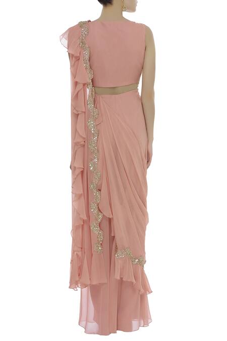 Pink Georgette Zardozi Embroidered Round Sequins And Ruffled Saree Jumpsuit