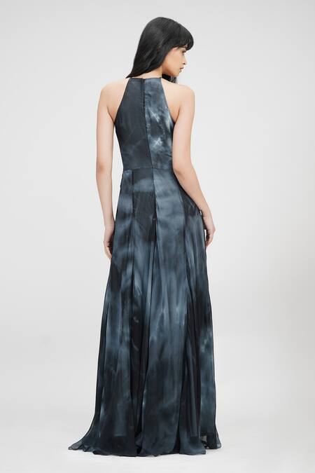 Black georgette tie-dyed gown featuring a halter neck and abstract pattern