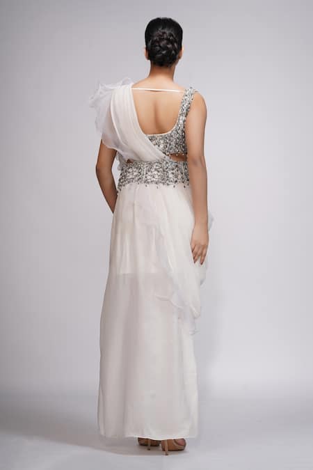 White Silk, Organza, Georgette Sequin, Tassel Leaf Neck Dhoti Saree With Blouse