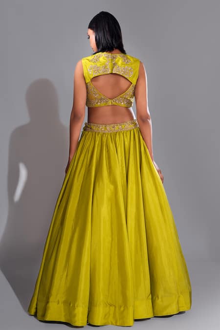 Green lehenga set featuring a dori embroidered blouse with a blunt V neckline and a back cut-out. Paired with a frill hem dupatta and embroidered waistbelt adorned with crystal hangings.