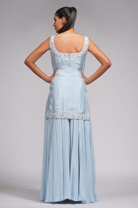 Powder blue kurta with sequin, pearl, zari, cutdana embroidery. Paired with sharara & dupatta.
