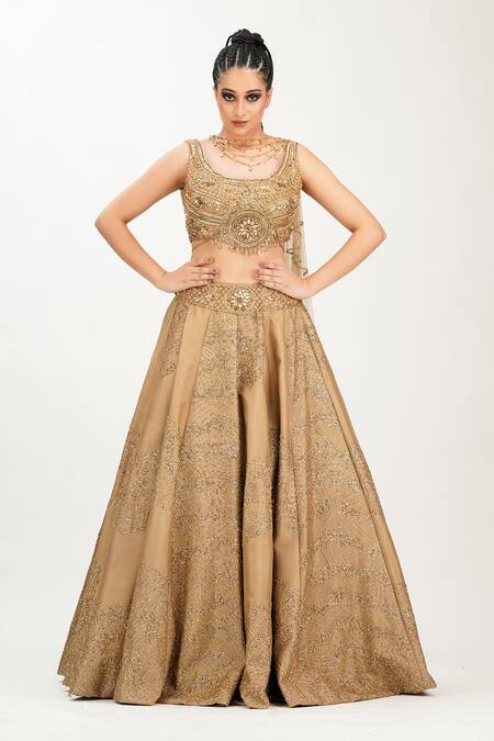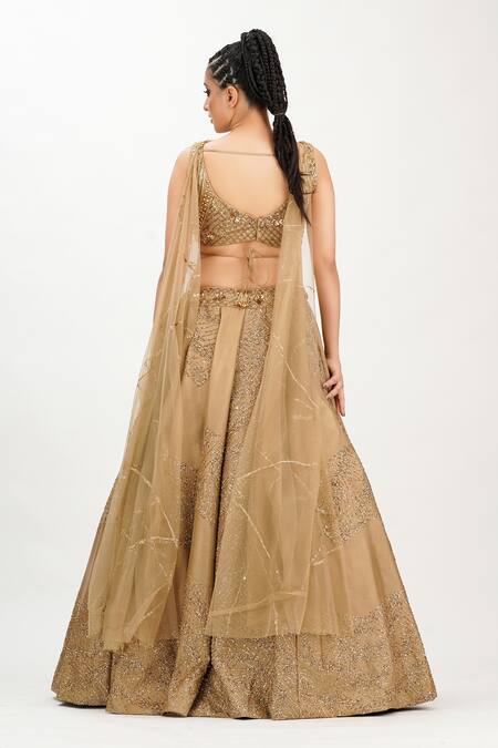 Buy_Shruti S_Gold Silk, Star Net Cutdana, Pearl Work, Sequin Round Embroidered Lehenga Set_at_Aza_Fashions