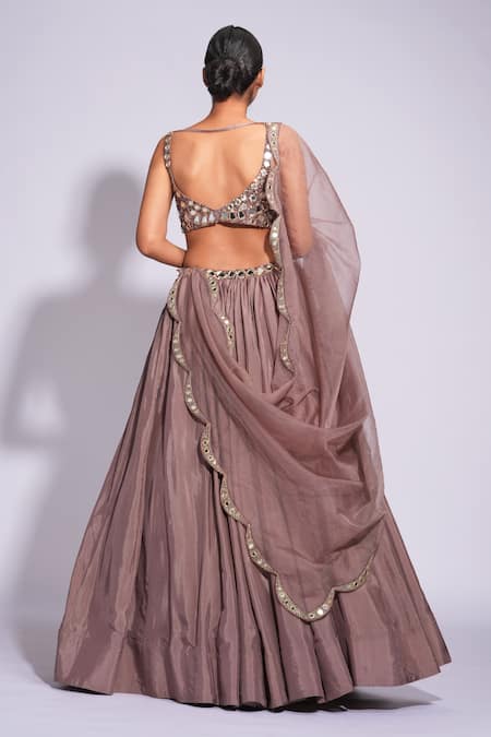 Padded blouse with intricate mirror embroidery, Dupatta featuring scallop border design, Embroidered waistline on lehenga