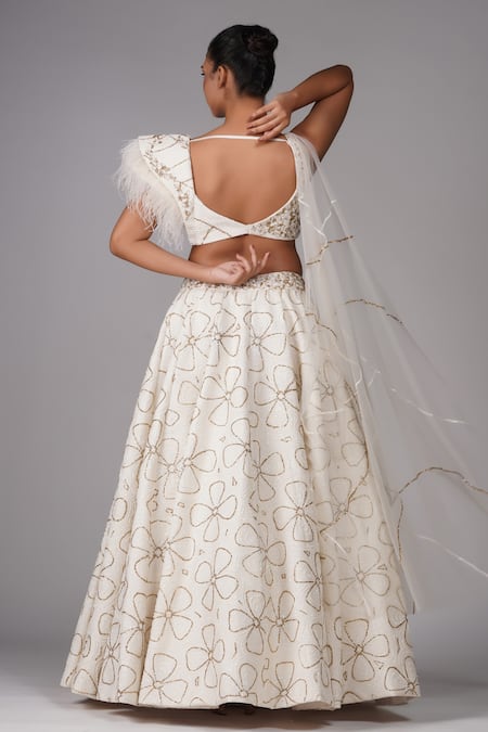 Off white lehenga featuring all over floral bloom embroidery in upcycled sequins and gold zari. Paired with a padded blouse adorned with feather applique, gold zari, and tonal sequin embroidery.
