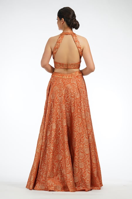 Burnt orange lehenga in silk base with floral motif hand block prints in gold. Paired with blouse & organza dupatta.
