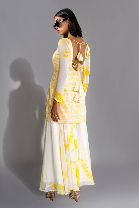 Yellow silk kurta featuring metallic hand block prints and a tasseled back. Paired with a white and yellow tie-dye sharara and a floral printed dupatta with a gota border.