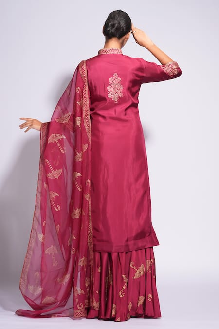Red Silk, Modal, Satin, Organza Embroidery Hand Block Printed Kurta Sharara Set
