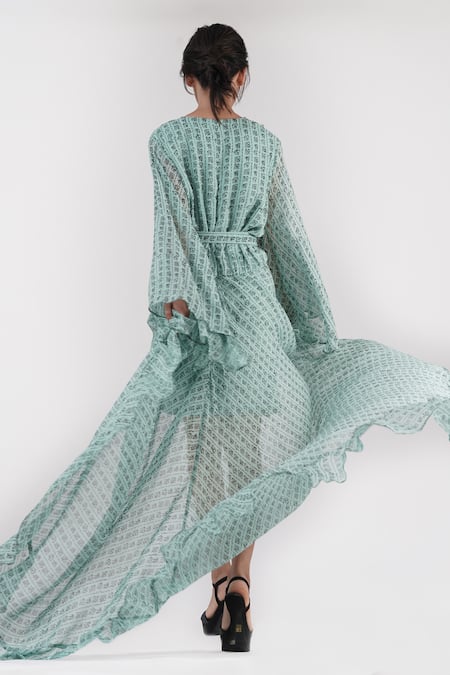 Green georgette wrap dress featuring a shawl collar surplice neck and umbrella sleeves. Paired with a hand-painted belt and designed with a high-low hem.