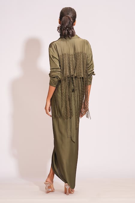 Olive green shirt featuring long cuff sleeves and tassel lace embellishments. Paired with a draped skirt that adds elegance to the ensemble.