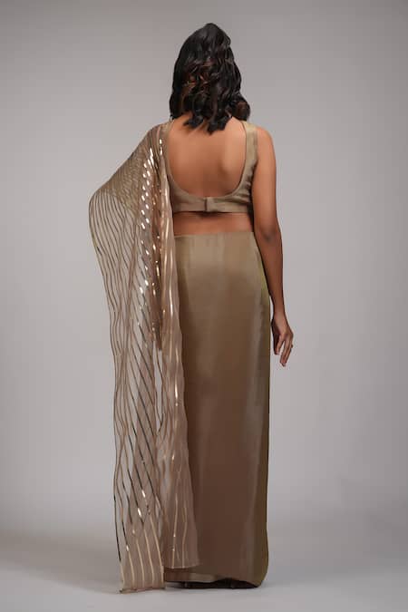 Gold pre-draped saree featuring metallic stripe embroidery on the pallu. Paired with a zari woven blouse with a back deep U neck design.