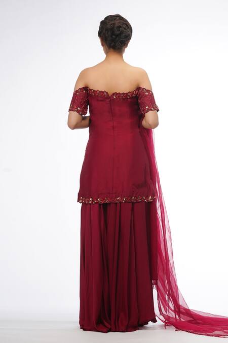 Dark red off-shoulder kurta with cutdana & sequin embroidered motifs. Paired with sharara & dupatta.