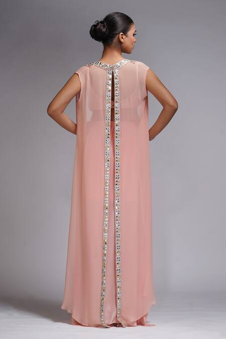 Peach Silk, Crepe Mirrors Placket Embroidered Cape And Draped Dhoti Skirt Set