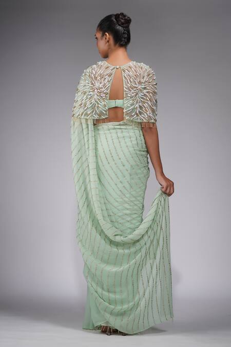 Sage green pre-draped saree crafted in georgette with badla embroidery in stripe pattern. Paired with a padded sleeveless blouse and a hand-embroidered cape featuring gold and white pearls.