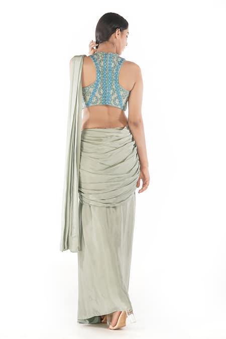 Sea green crepe solid pre-draped saree. Paired with silk embroidered racer blouse.