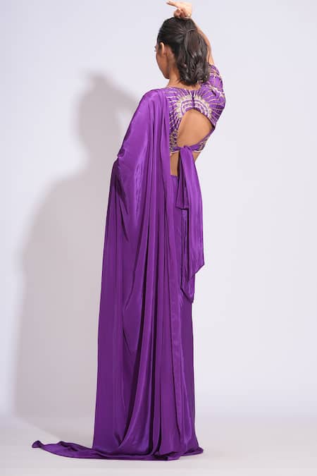 Buy_Shruti S_Purple Silk, Crepe Sequins, Pearls, Cut Pre-draped Saree With Embroidered Blouse _Online_at_Aza_Fashions