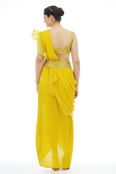 Buy_Shruti S_Yellow Blouse Silkdhoti  Silkruffles  Organzadrape  Pre-draped Saree With_at_Aza_Fashions