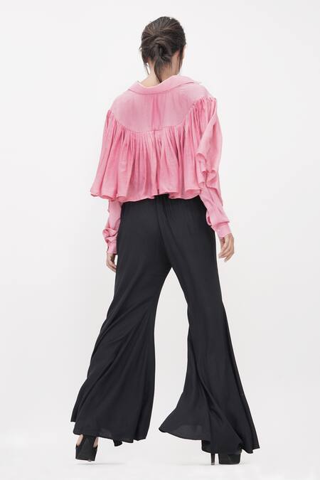 Pink cotton shirt featuring ruffle trim across the shoulders and back