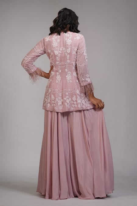 Baby pink peplum style kurta featuring sequin and cutdana embroidery in floral pattern. Paired with a sharara and cutwork bordered sheer dupatta.