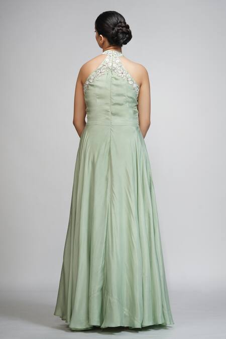 Buy_Shruti S_Green Silk Cutdana, Pearl, Sequin, Zari Halter Neck Gown_Online_at_Aza_Fashions