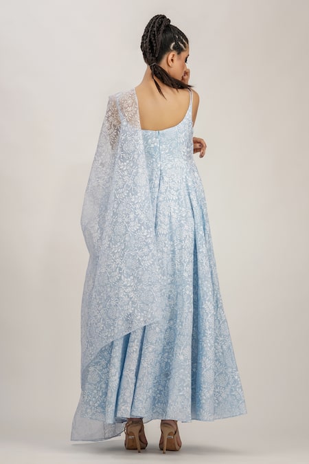 Ice blue silk anarkali in hand block print and embroidered detail. Paired with printed dupatta and churidar pant.