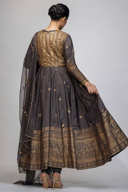 Slate grey silk anarkali in hand block print and embroidered detail. Paired with embroidered jacket, dupatta and churidar pant.