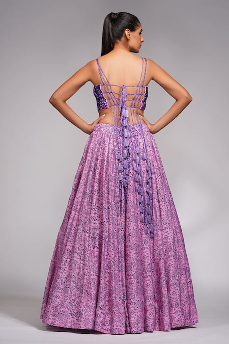 Pink lehenga with floral print & pleated pattern. Paired with cutdana, floral embroidered blouse & dupatta.