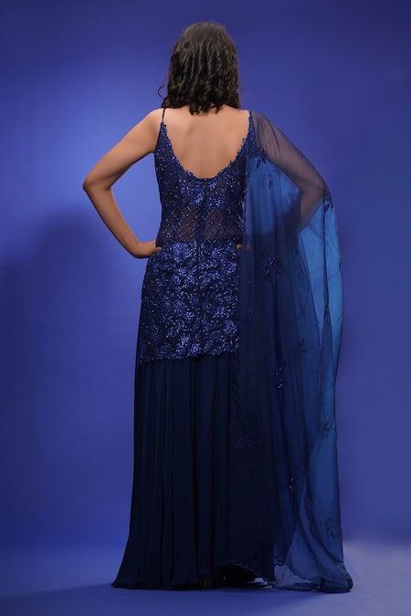 Navy blue embroidered strappy kurta in upcycled sequins and thread work. Paired with scallop dupatta and sharara.