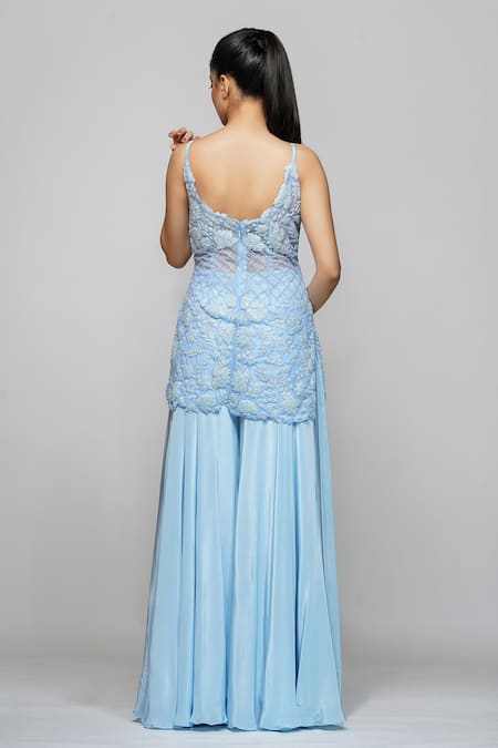 Ice blue embroidered strappy kurta in upcycled sequins and thread work. Paired with scallop dupatta and sharara.