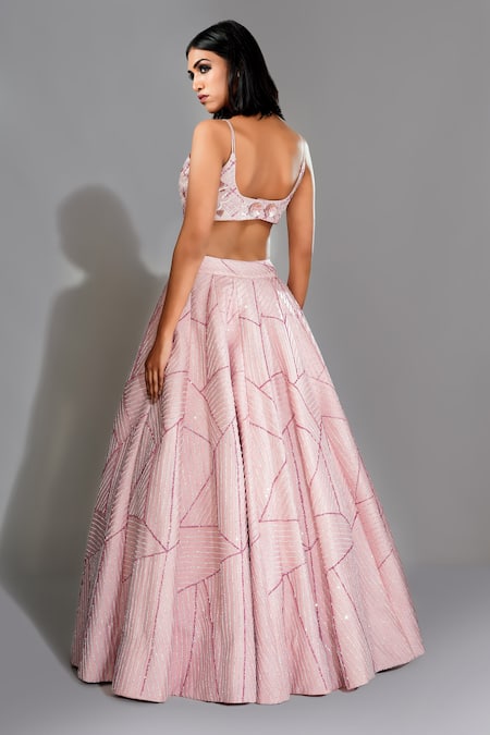 Baby pink lehenga featuring intricate silver and dark pink zari embroidery. Accompanied by a padded blouse with 3D sequin embroidery and a triangular edged dupatta.