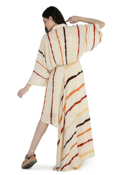 Multi color asymmetrical kimono dress featuring a collared neckline and wide sleeves
