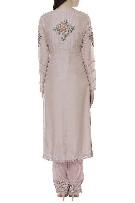 Floral motif work pink hued kurta and straight pant. Comes with chiffon dupatta.