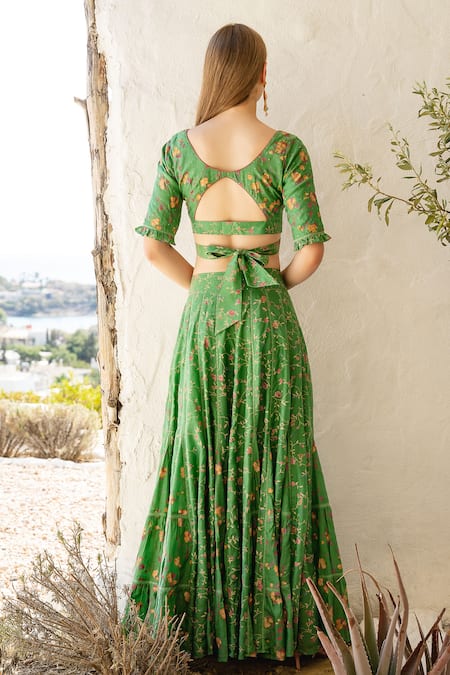 Green lehenga with multicolor floral printed motifs and sequin embellishment. Comes with matching blouse.