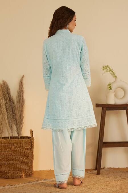 Blue cotton kurta featuring schiffli pattern and cutwork lace embroidered border. Paired with a pant and scallop bordered sheer dupatta.