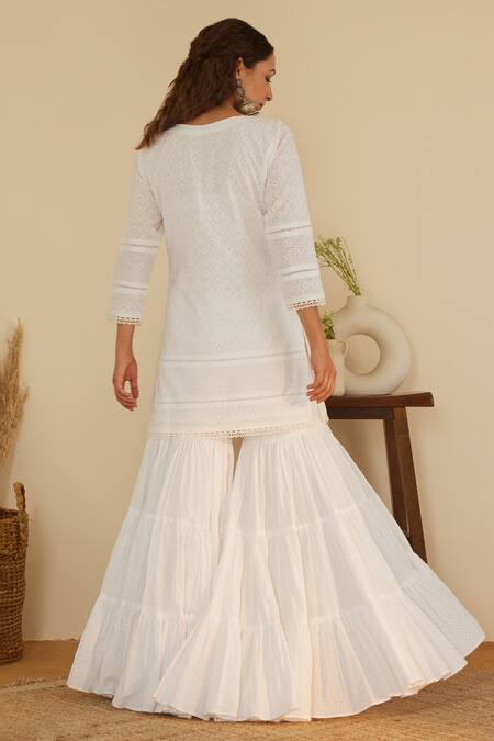 White kurta featuring schiffli pattern, cutwork lace embroidered border, and a round neckline. Paired with a tiered gharara and scallop border sheer dupatta.
