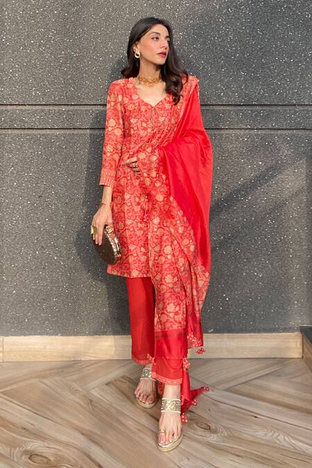 Orange kurta featuring all-over floral print with a front tie detail. Paired with plain pant and a floral print border dupatta.