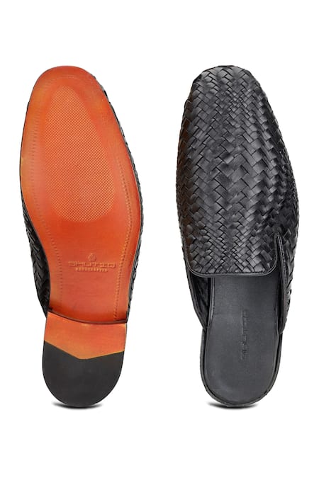 Black leather mules featuring a handwoven basket pattern and almond toe design