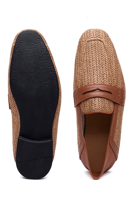 Tan brown loafers featuring a T-shaped penny bar stitched design.